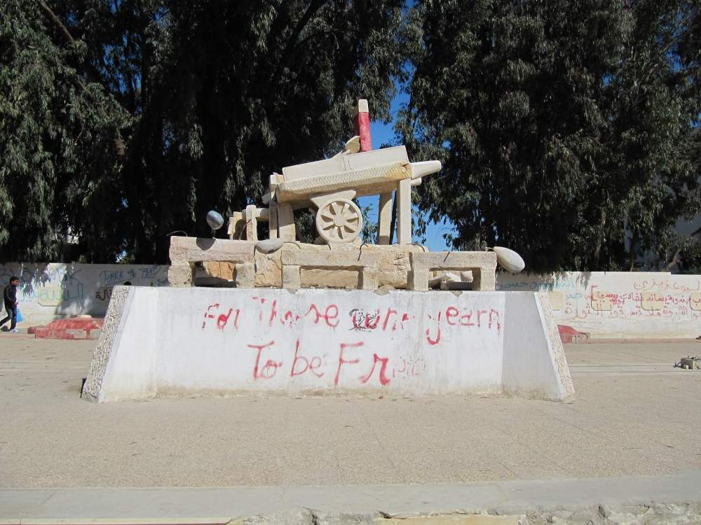 Oggi cosa rimane di tutto questo a Sidi bouzid? Rimane l’orgoglio di essere stati i primi. Ma rimane anche l’amaro in bocca per aver sacrificato la vita di molti giovani e essere rimasti tutto sommato poveri e disperati come prima. La via principale del paese ribattezzata Boulevard Mohamed Bouazizi e sulla piazza principale è stato costruito un piccolo monumento che rappresenta la carretta del venditore ambulante. Molti graffiti e tag. La scritta “ACAB” un po’ ovunque. E poi l’aria diversa che si respira. Qui la gente cammina a testa alta e parla. Dice quel che vuol dire. Non c’è più quella paura che c’era negli anni 90.