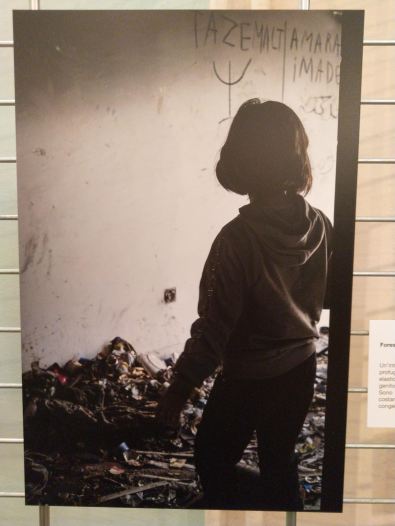 Un foto mi ha colpito in modo particolare. In questa foto, una bambina o un ragazzo, entra in una stanza abbandonata piena di immondizia. Le pareti sono coperte di graffiti. Chiedo alla fotografa, se sa cosa dicono questi graffiti … Mi dice di no, ma che il segno che si vede è molto diffuso in questi luoghi.